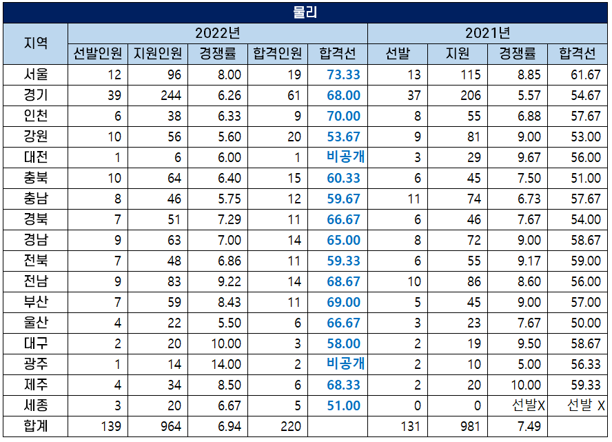2022년도 중등임용고시 물리 과목 1차 시험 합격선은 대구시를 제외하고 2021년보다 상승했습니다. 가장 높은 커트라인을 기록한 서울시의 합격선은 73.33점으로 지난해보다 커트라인 61.67점보다 11.66점 상승했습니다.
