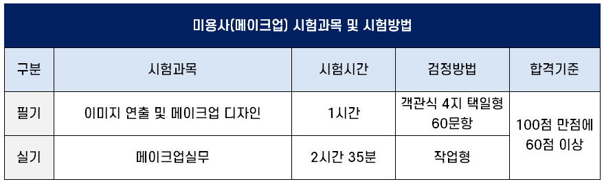 | 필기 | 이미지 연출 및 메이크업 디자인 | 1시간 | 객관식 4지 택일형 60문항 |