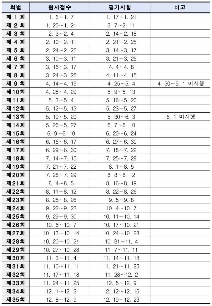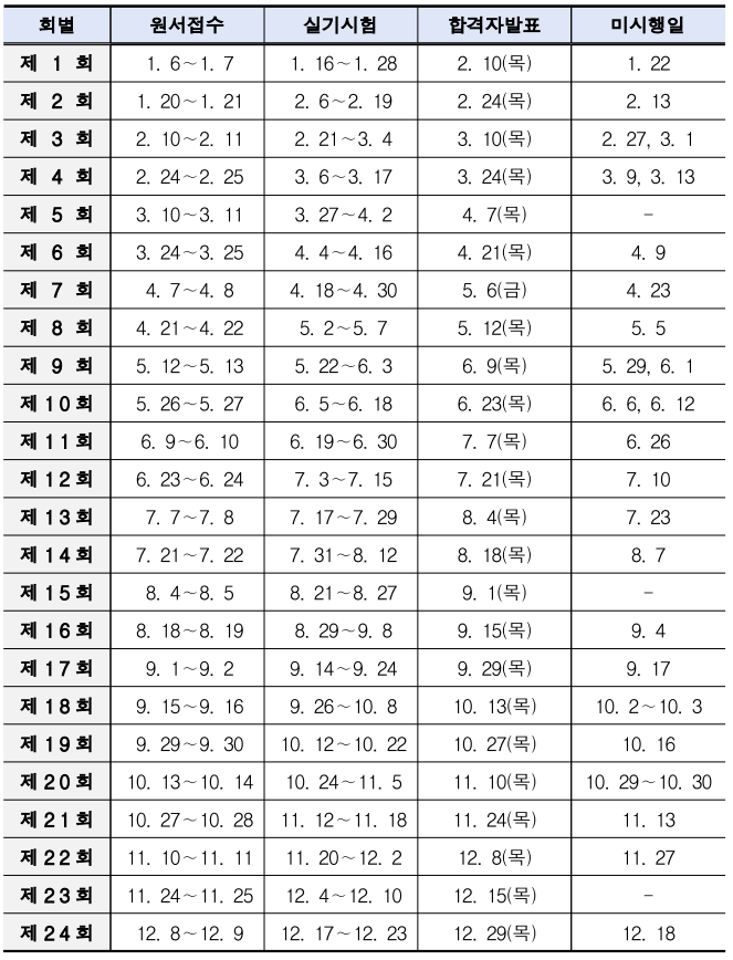 | 회별 | 원서접수 | 실기시험 | 합격자 발표일 |