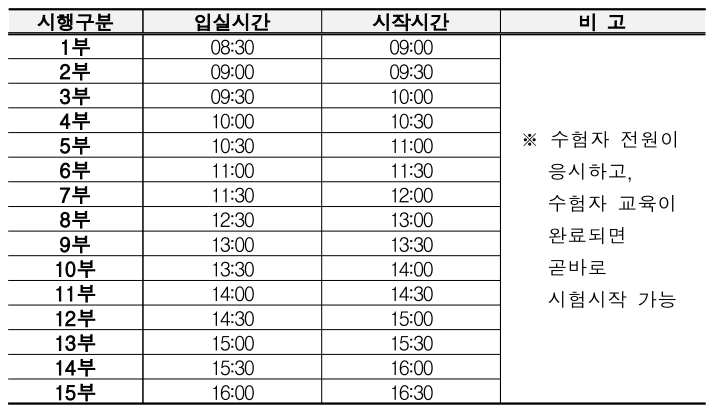 미용사 실기시험은 1부~15부로 나누어 아래 시험시간표에 따라 시행됩니다.