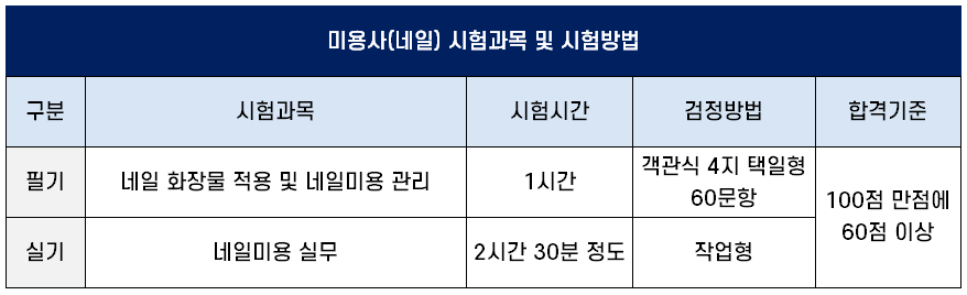 | 필기 | 네일 화장물 적용 및 네일미용 관리 | 1시간 | 객관식 4지 택일형 60문항 |