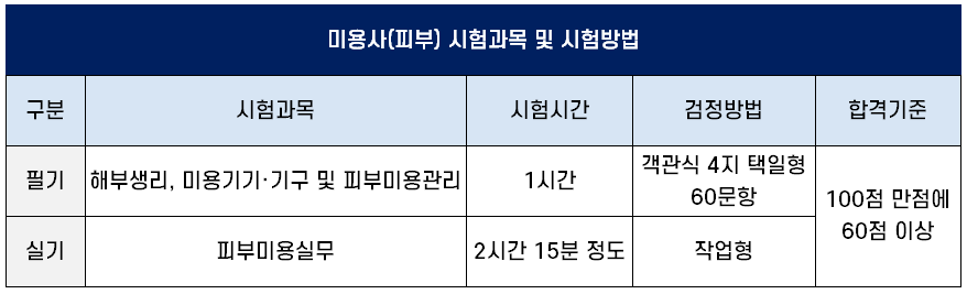 | 필기 | 해부생리, 미용기기·기구 및 피부미용관리 | 1시간 | 객관식 4지 택일형 60문항 |