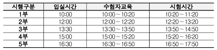 CBT방식인 미용사 필기시험은 1부~5부로 나누어 아래 시험시간표에 따라 시행되며, 전산을 통해 자동 채점되기 때문에 필기시험 응시일에 합격여부를 바로 알 수 있습니다.