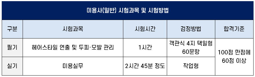 | 필기 | 헤어스타일 연출 및 두피·모발 관리 | 1시간 | 객관식 4지 택일형 60문항 |