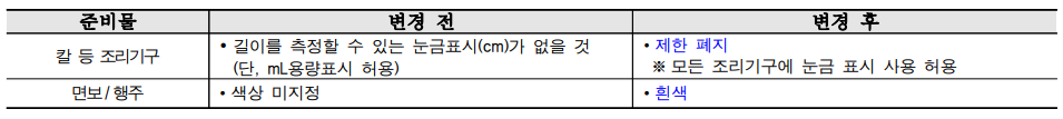 모든 조리 기능사 실기 시험 공통으로 지참 준비물 규격이 변경되어 2022년부터는 모든 조리기구에 눈금 표시 사용이 허용되며, 면보나 행주는 흰색으로 준비해야 합니다.
