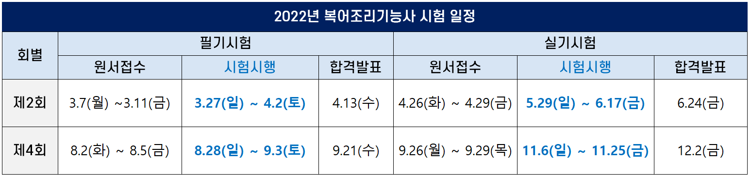 정기 기능사 제2회와 제4회 시험일정에 따라 2번 시행되는 2022년 복어조리 기능사 시험일정은 다음과 같습니다.