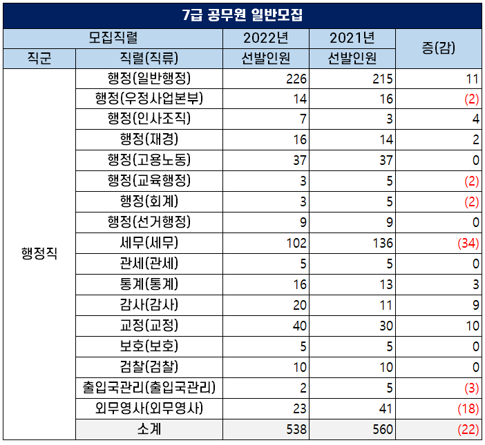 2022년 7급 국가공무원 일반모집 행정직 티오는 전년대비 22명이 감소했는데요.
