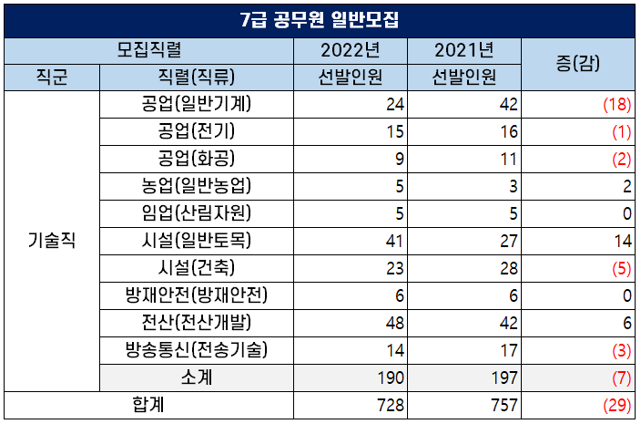 2022년 7급 공무원 기술직 티오는 전년 대비 7명이 감소했는데요. 직렬별로 살펴보면 일반기계 직렬의 선발예정인원이 18명이 감소해 티오가 가장 많이 줄었습니다.