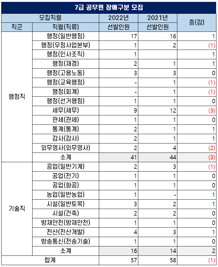 2022년 7급 국가공무원 장애구분 모집 직렬별 티오
