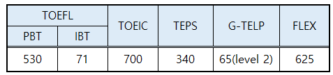 7급 통계직 1차 시험 합격을 위한 한국사능력시험 기준 등급은 2등급 이상, 영어시험 종류 및 기준 점수는 아래 표와 같습니다.