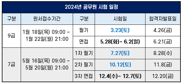 2024년 9급 통계직 필기시험은 3월 23일(토)에, 7급 통계직 1차 PSAT 시험은 7월 27(토)에, 2차 필기시험은 10월 12일(토)에 시행되며, 원서접수기간 및 합격자 발표일 등 상세한 시험 일정은 다음과 같습니다.