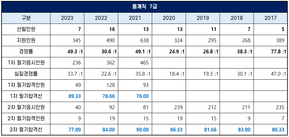 2017년 77.8대 1의 높은 경쟁률을 기록했던 통계직 7급은 2020년 24.9대 1까지 경쟁률이 하락했었는데요. 2021년 PSAT 도입이후 경쟁률이 상승해 2023년에는 49.3대 1의 경쟁률을 기록했습니다.