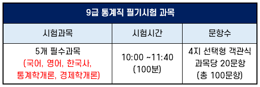2022년부터 9급 교정직 1차 필기시험과목에서 고교 교과목인 사회, 과학, 수학 과목인 제외되면서 선택과목이 폐지되고 필수과목 5개, 국어, 영어, 한국사, 통계학개론, 경제학개론이 시험과목이 되었습니다. 따라서 2022년부터는 9급 통계직 공무원이 되고자 하는 수험생은 통계학개론과 경제학개론을 반드시 공부해야 합니다.