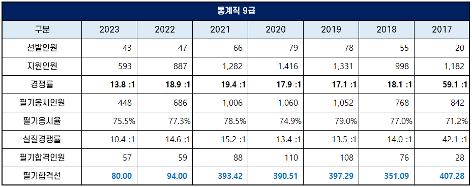 9급 통계직 필기 합격선은 2022년 평균 94.00점, 2023년에는 80.00점을 기록했습니다.