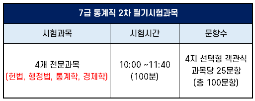 영어와 한국사 기준점수 이상의 성적 제출하고, 1차 PSAT 합격선 이상을 득점해 합격하면 2차 필기시험에 응시할 수 있는데요. 2차 필기시험은 7급 통계직 전문과목인 헌법, 행정법, 통계학, 경제학의 4과목이 시험과목입니다.