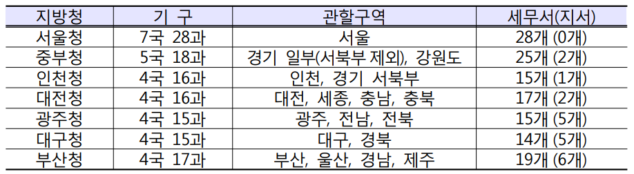 국세청은 본청과 부속기관(국세공무원교육원, 주류면허지원센터, 국세상담센터) 및 7개 지방청과 133개 세무서(21개 지서)로 구성된 조직인데요.