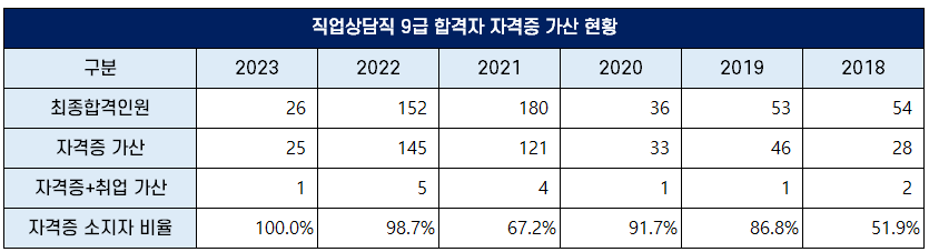 2018년에는 9급 직업상담직 공무원 합격자의 51.9%가 자격증 소지로 가산점을 받았었는데 2023년에는 100%로 증가했습니다.
