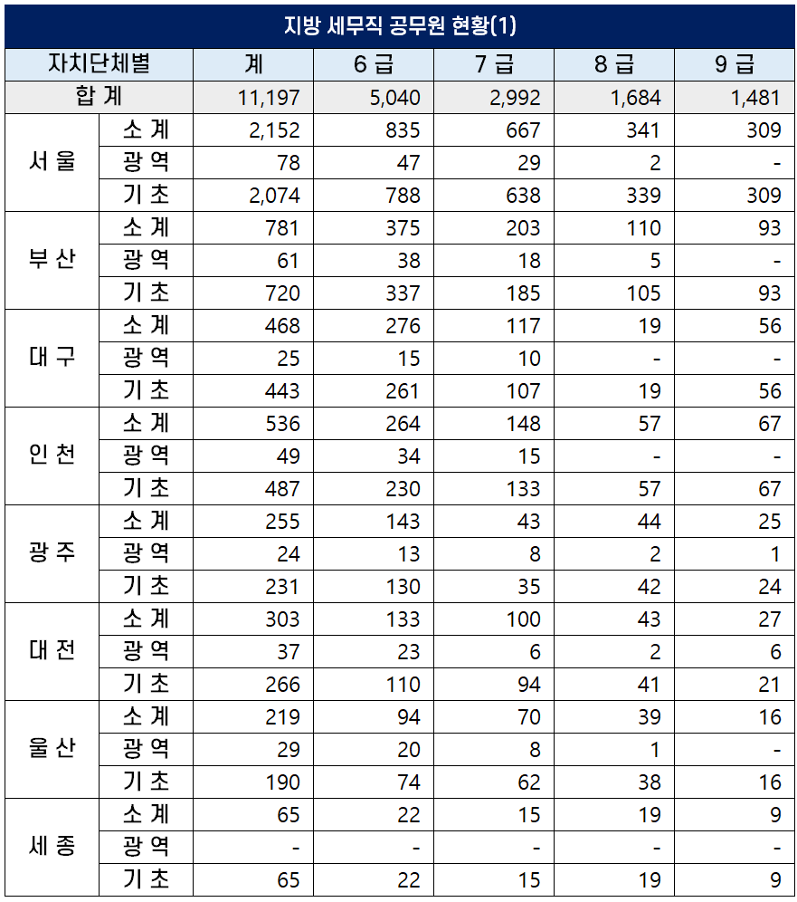 2022년 지방세통계연감에 따르면 2021년 12월 31일 기준 전국 17개 지방자치단체의 지방세무직 공무원은 총 11,197명이며, 9급 공무원이 1,481명, 7급 공무원이 2,992명입니다.