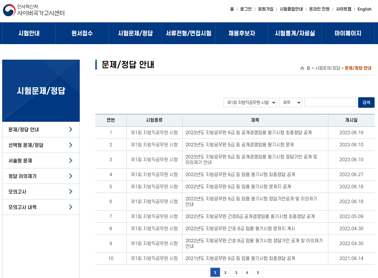 9급 지방 세무직 시험 과목은 17개 지방자치단체에서 인사혁신처에 위탁 출제하기 때문에 시험문제가 동일하고 기출문제와 정답을 공개하고 있습니다. 아래 그림을 클릭하시면 기출문제를 다운로드할 수 있는 인사혁신처 사이버국가고시센터로 이동합니다. 제1회 지방직 공무원 시험으로 검색하면 지방직 9급 공무원 시험 문제를 볼 수 있습니다.