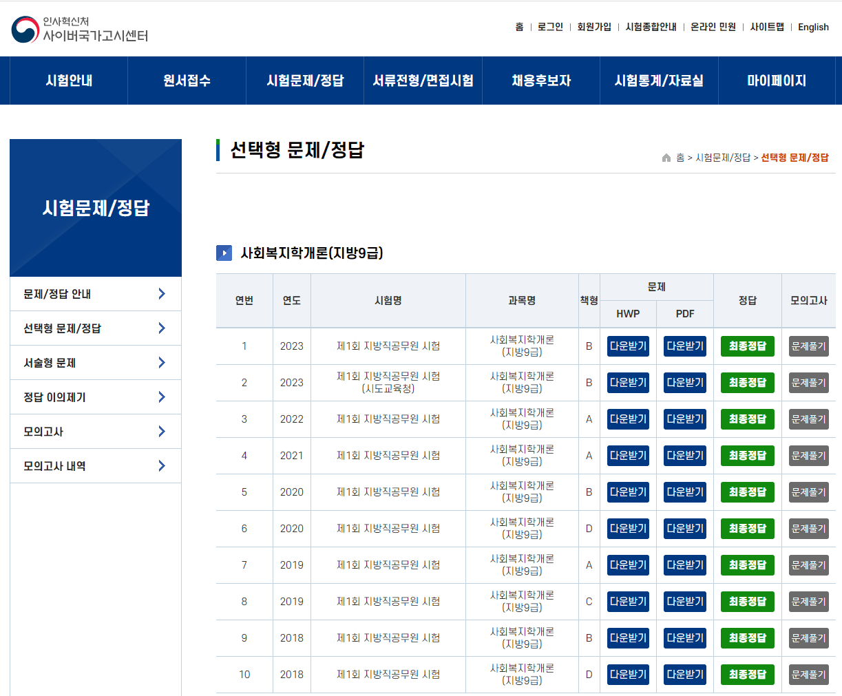 사회복지직 지방 공무원 시험문제는 17개 시도에서 인사혁신처에 위탁해 출제하고 있기 때문에 인사혁신처 사이버국가고시센터에서 기출 시험 문제와 확정정답을 공개하고 있습니다.