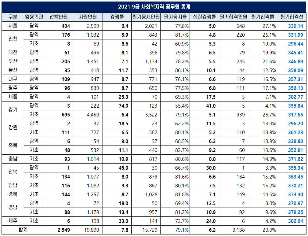 2021년 사회복지직 공무원 선발인원, 경쟁률 및 커트라인(합격선)