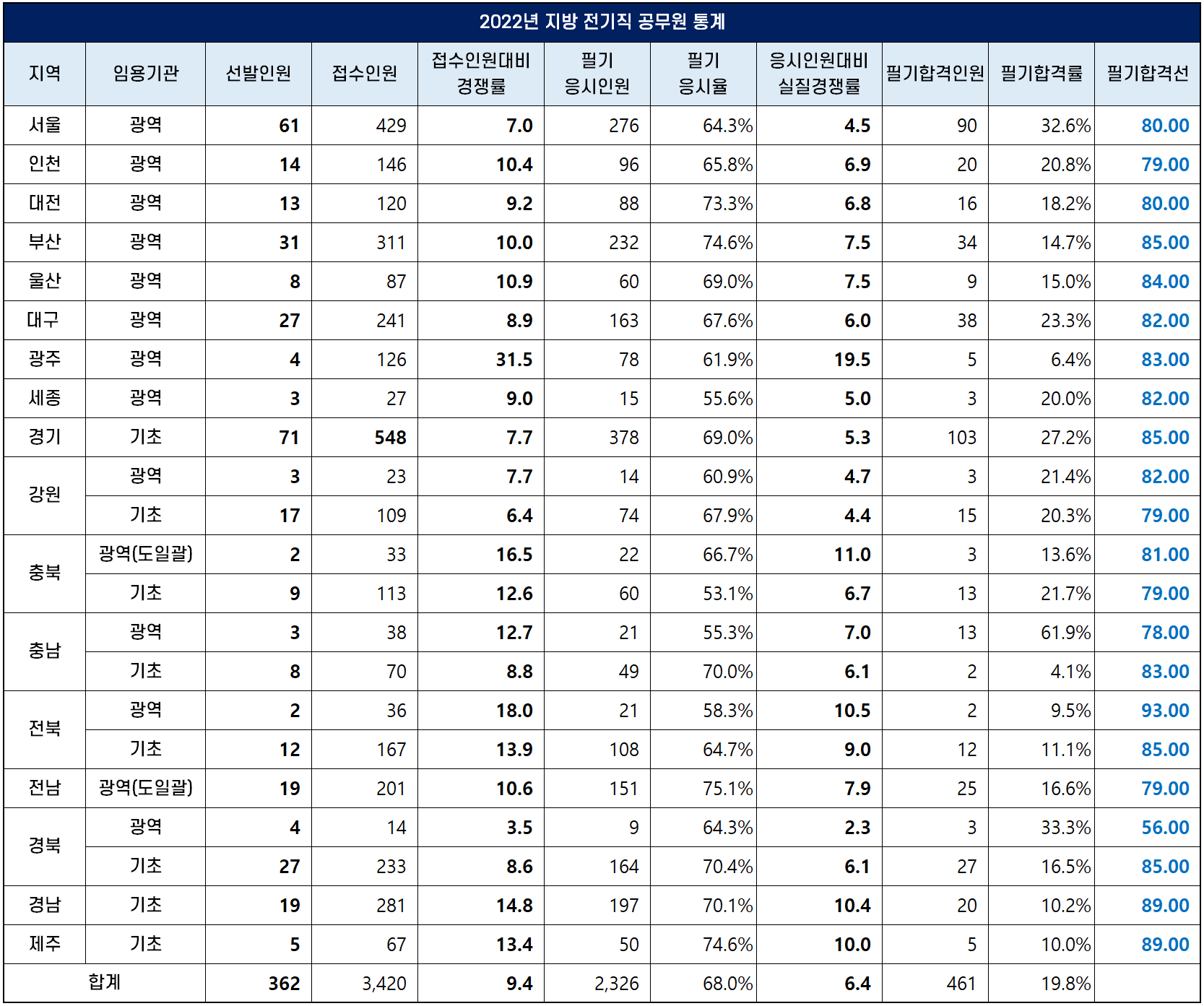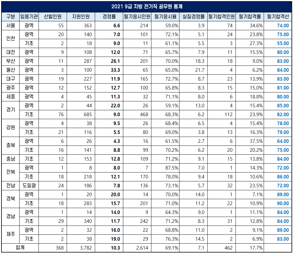 서울, 부산, 대구, 인천, 광주, 대전, 울산, 세종, 경기, 강원, 충북, 충남, 전북, 전남, 경북, 경남, 제주도의 17개 시도 지방자치단체에서 채용하는 지방직 9급 전기직 공무원의 선발인원, 경쟁률, 커트라인 등의 통계를 아래 표로 정리했는데요.