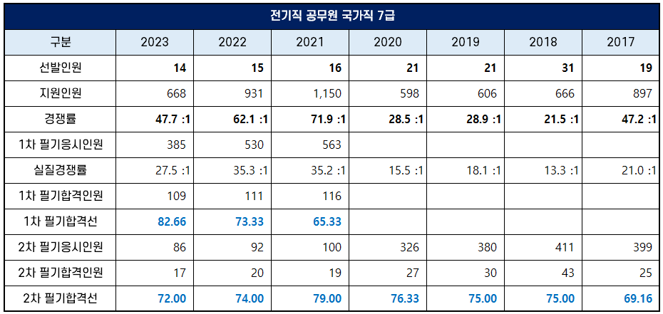 2023년까지 국가직 7급 전기직 공무원의 선발인원, 경쟁률, 필기시험 커트라인을 아래 표로 정리했습니다.