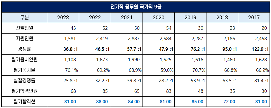 2023년까지 최근 전기직 공무원의 선발인원, 경쟁률, 필기시험 커트라인을 아래 표로 정리했습니다(모바일 환경에서는 표 아래 있는 그림을 보시기를 권장합니다).