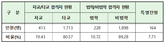 학부와 로스쿨이 같은 자교 출신은 413명으로 전체 합격자의 19.43%이며, 타교 출신은 1,713명(80.57%)입니다.