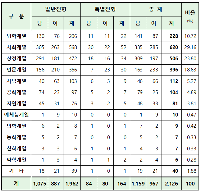 로스쿨 합격자 중 사회계열을 전공자가 620명(29.16%)으로 가장 많았고, 2위는 506명(23.08%)이 합격한 상경계열 전공자이며 3위는 396명(18.63%)이 합격한 인문계열 전공자입니다.