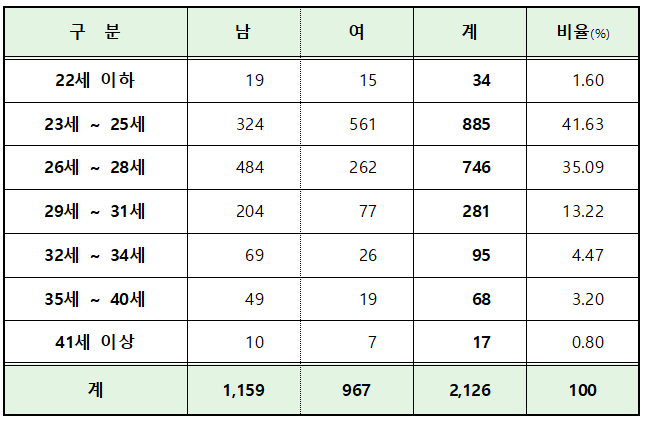 로스쿨 합격자의 연령별 현황을 살펴보면, 23~25세가 885명으로 가장 많아 전체의 41.63%를 차지하고 있습니다. 26~28세는 746명(35.09%), 29~31세는 281명(13.22%)이며, 41세 이상에서도 17명의 합격자가 나왔습니다.