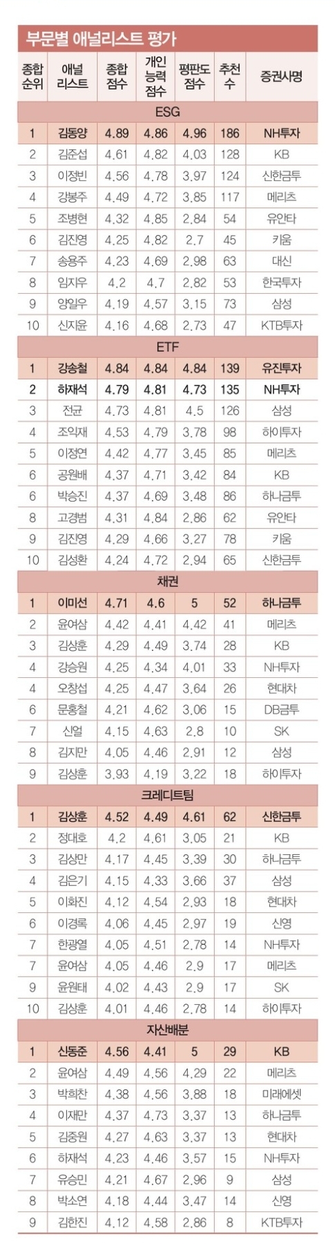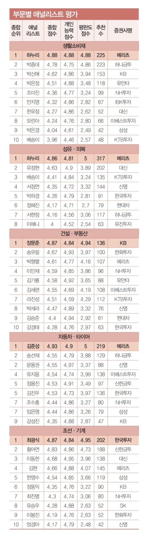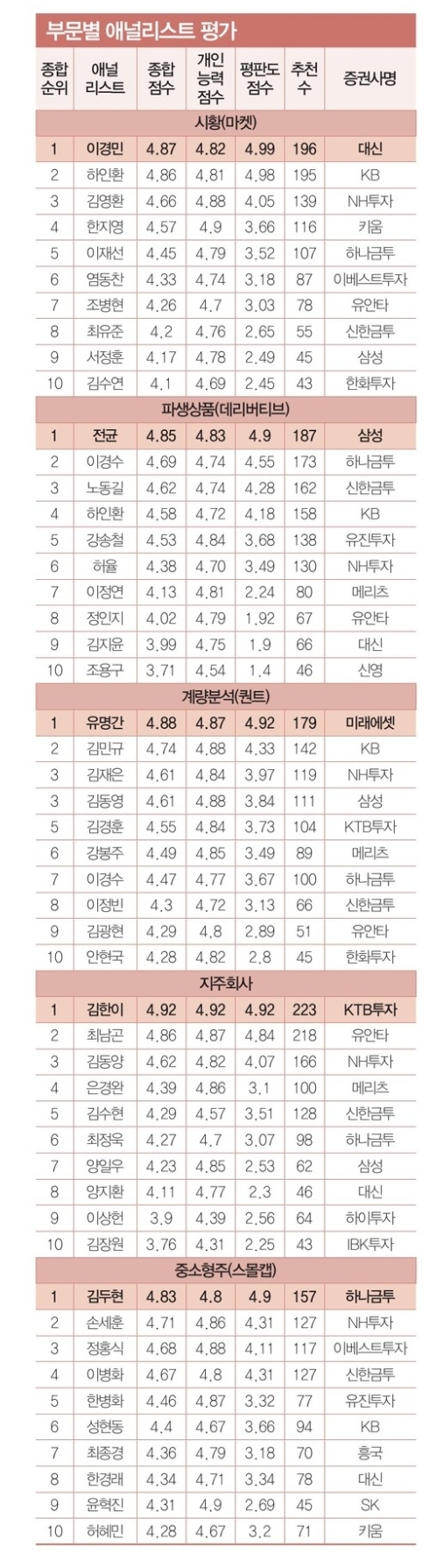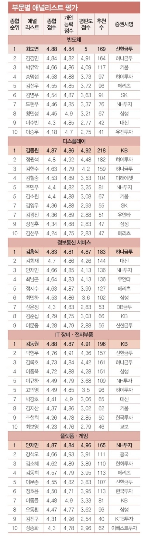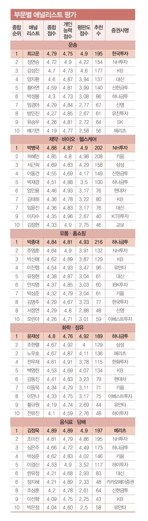 2021년 한경 베스트 애널리스트 부문별 순위 (+ 상반기 하반기 비교 정리)