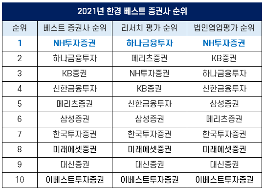 1,093명의 펀드매니저가 참여한 2021년 하반기 한경 비즈니스 베스트 증권사 선정 결과에 따르면 NH투자증권이 리서치 평가에서는 2위를 했지만 법인영업평가에서 좋은 평가를 받아 종합 순위 1위에 올랐습니다.