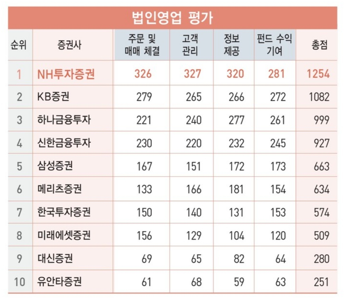 참고로 베스트 증권사를 선정하는 법인영업평가는 주문 및 매매 체결, 고객관리, 정보제공, 펀드 수역 기여의 4가지 부문으로 평가합니다.