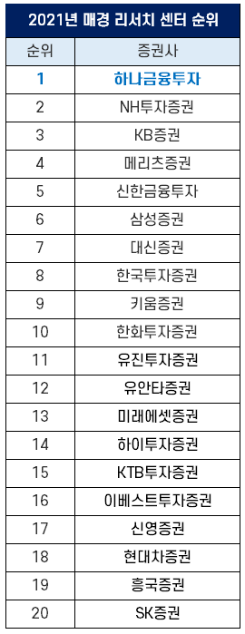 2021년 매경이코노미가 선정한 증권사 리서치 센터 순위 1위는 하나금융투자인데요. 2017년 이후 6년 연속 1위에 올랐습니다. 아래에서 살펴보는 것처럼 하나금융투자는 한경비즈니스에서 발표한 베스트 증권사 순위 리서치 평가에서도 1위에 올라 최고의 리서치 보고서를 내는 증권사로 꼽혔습니다.