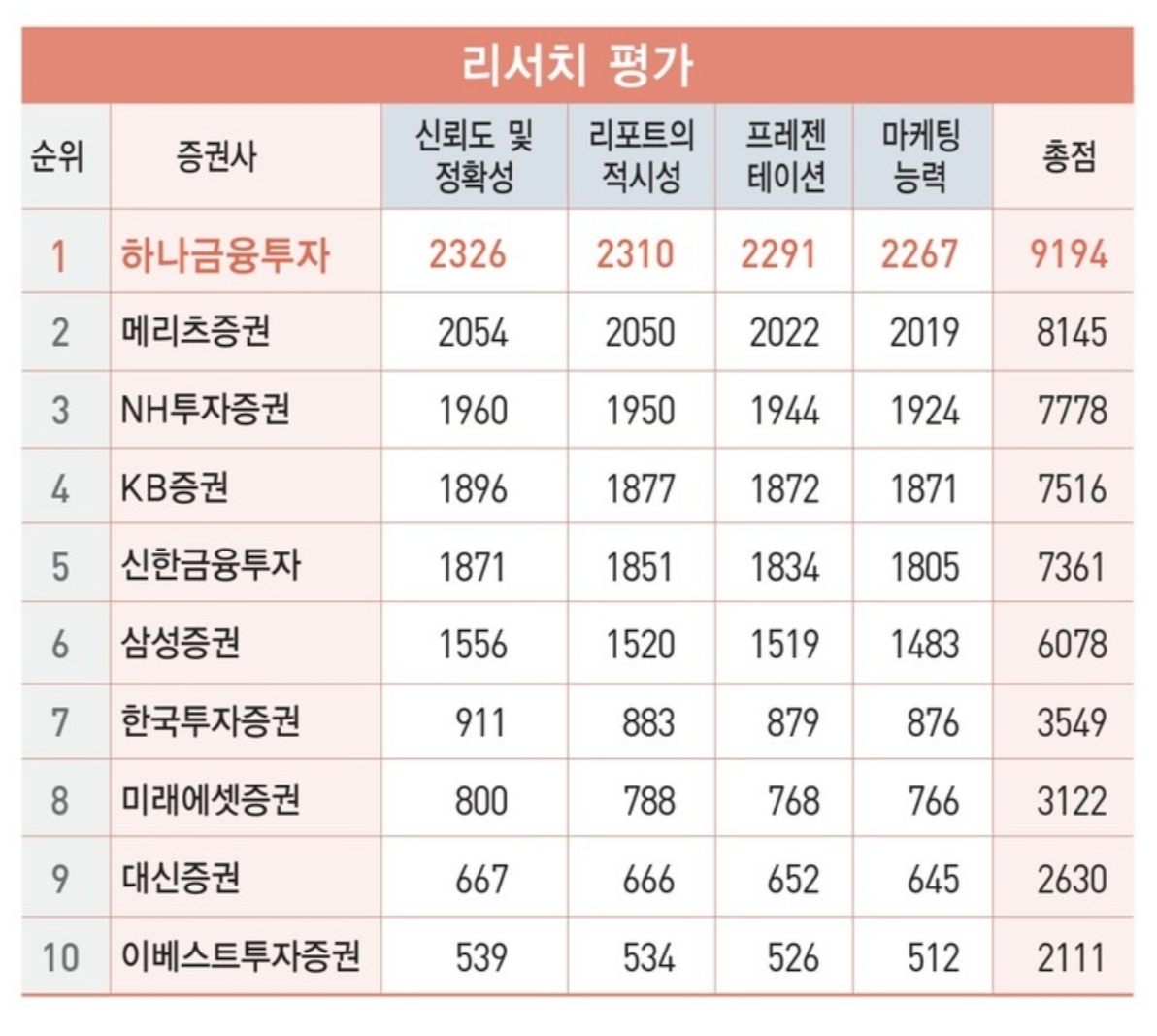 한경의 리서치 센터 순위는 리서치의 신뢰도 및 정확성, 리포트의 적시성, 프레젠테이션, 마케팅 능력의 4개 분야로 평가를 하는 리서치 평가순위라고 볼 수 있는데요. 하나금융투자가 모든 분야에서 좋은 평가를 받으며 1위에 올랐습니다.