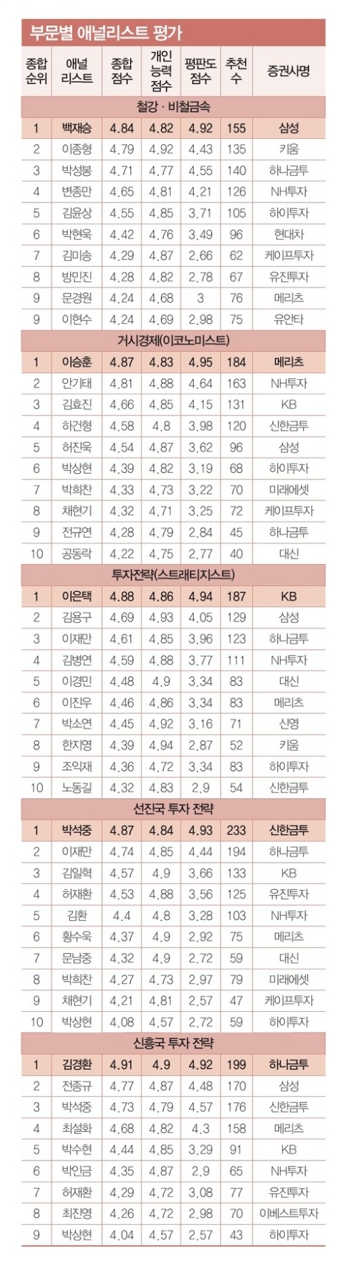 2위는 삼성증권의 김용구, 3위는 하나금융투자의 이재만, 4위는 NH투자증권의 김병연, 5위는 대신증권의 이경민 애널리스트입니다.