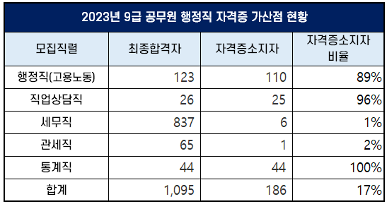 2023년 9급 공무원 공채 시험 최종 합격자 중 자격증 소지로 가산점을 받은 직렬은 행정직(고용노동), 직업상담직, 세무직, 관세직, 통계직뿐이었는데요. 9급 행정직 응시자가 가산점을 받는 자격증이 주로 직업상담사 1급과 2급, 사회조사분석사 1급과 2급 자격증임을 알 수 있습니다.