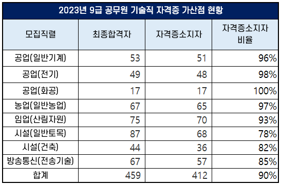 2023년 기술직 9급 공무원 공채 시험 최종 합격자 중 자격증 소지로 가산점을 받은 직렬과 합격자 및 자격증 소지자와 자격증 소지자 비율은 아래 표와 같습니다(일반 모집 기준).