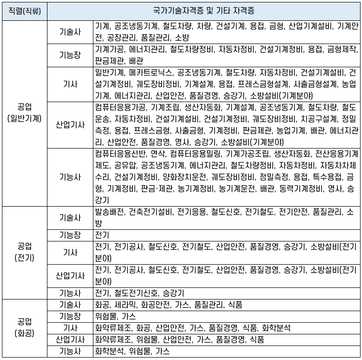 공업(일반기계, 전기, 화공) 직렬 가산 대상 자격증