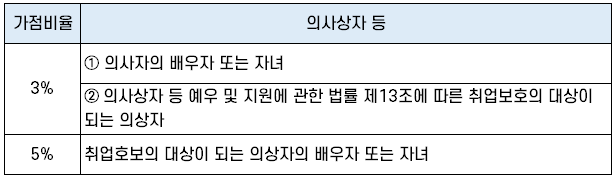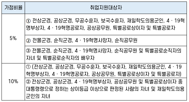 | ① 취업지원대상자 | 과목별 만점의 5% 또는 10% |