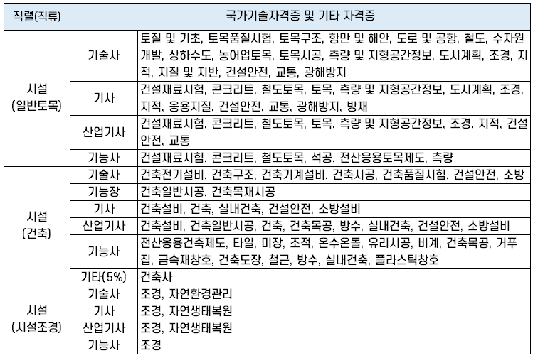 시설(일반토목, 건축, 시설조경) 직렬 가산 대상 자격증