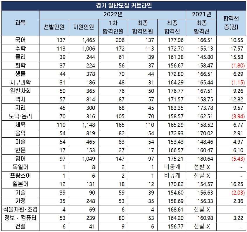 경기도 교육청에서 선발하는 공립 중등 학교 교사, 보건·사서·전문상담·영양· 특수(중등)교사 최종 합격인원 및 합격선은 아래 표와 같은데요. 화학, 지구과학, 도덕·윤리, 영어, 기술 과목을 제외하고는 지난해보다 커트라인이 상승했습니다.