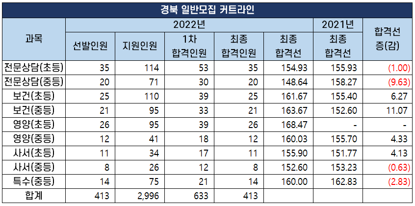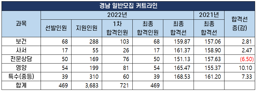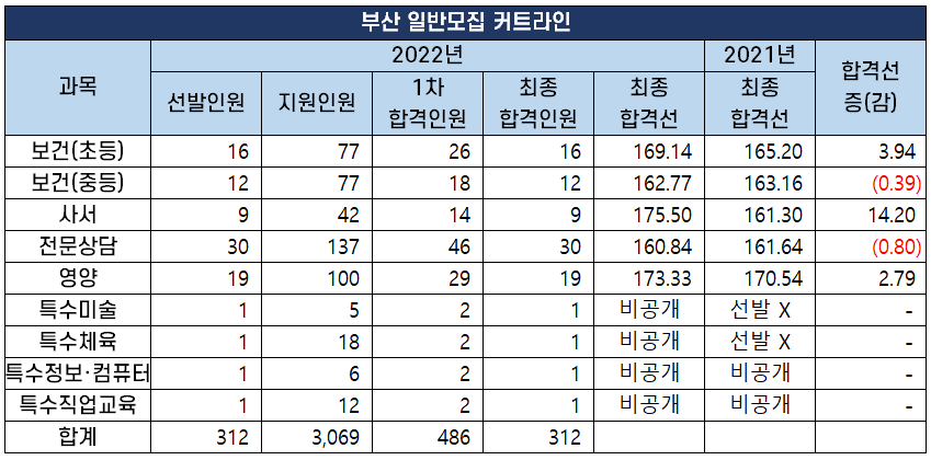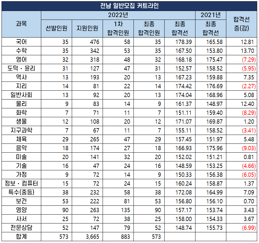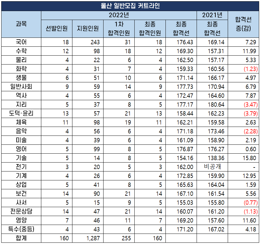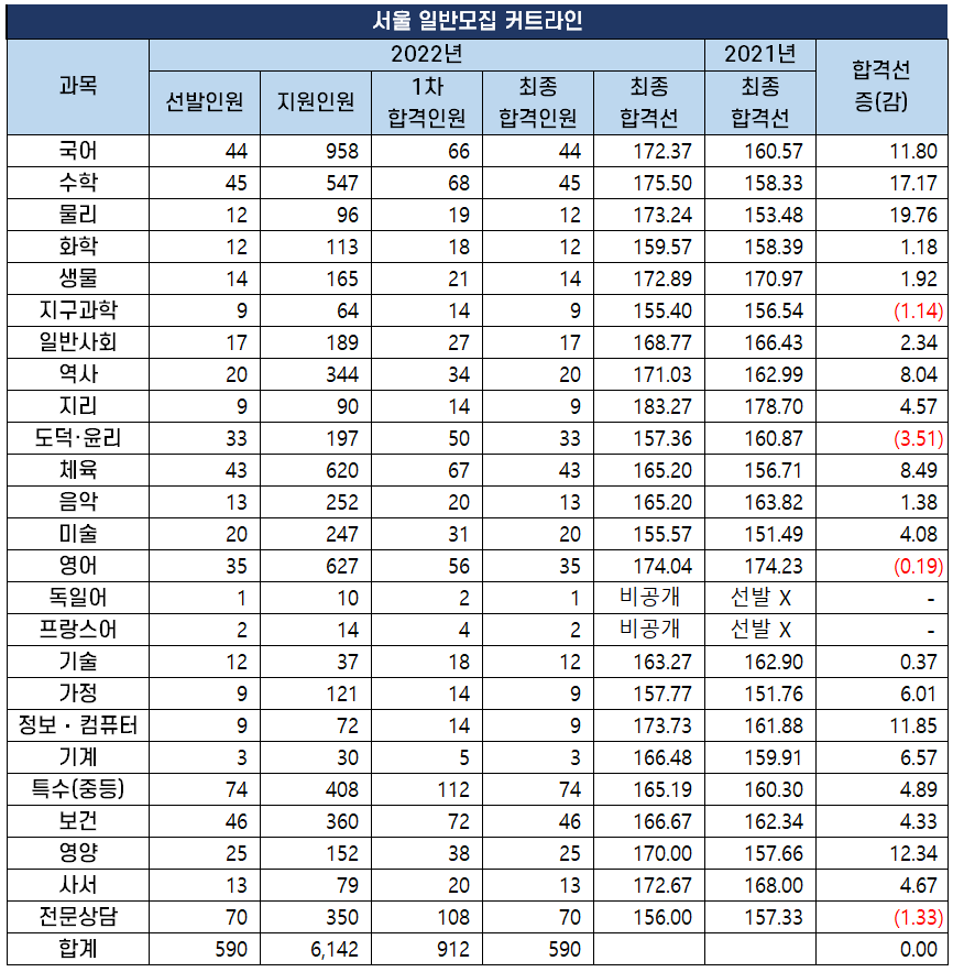 2022년도 중등임용고시 최종 커트라인 과목별 비교 분석 2022년 2월 10일 전국 17개 시도 교육청에서 시행하는 2022년도 공립 중등학교 교사, 특수(중등), 보건, 영양, 사서, 전문상담교사 임용 시험의