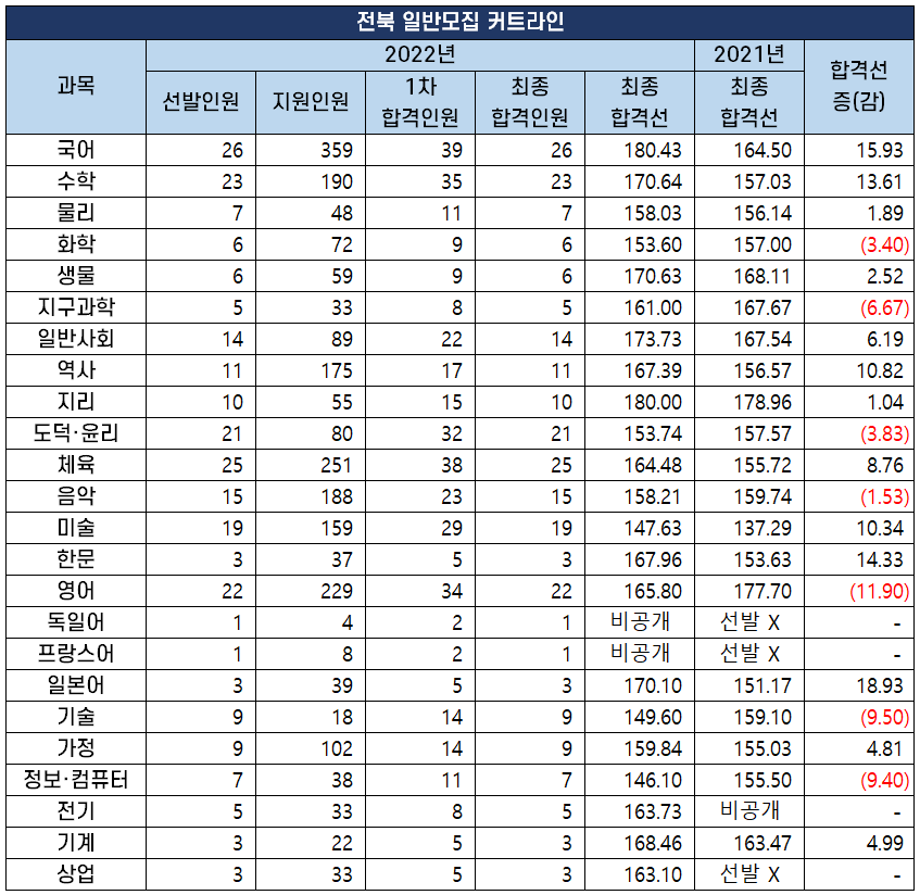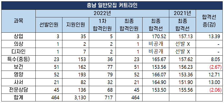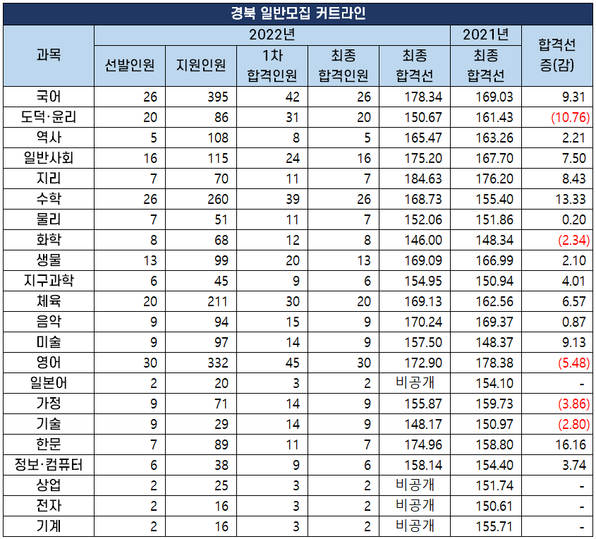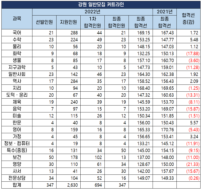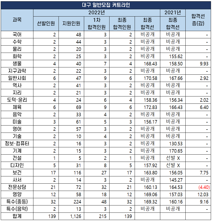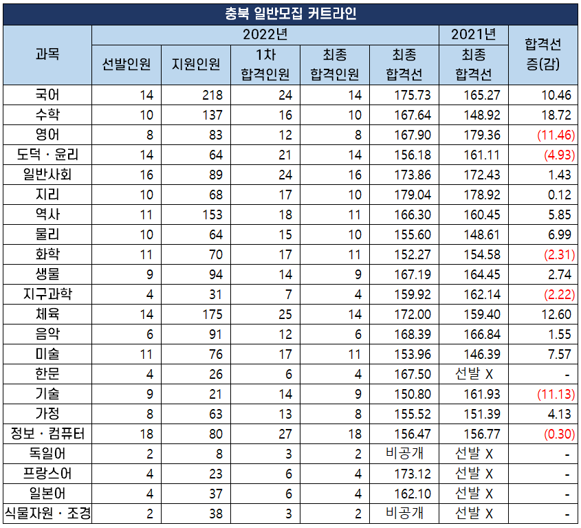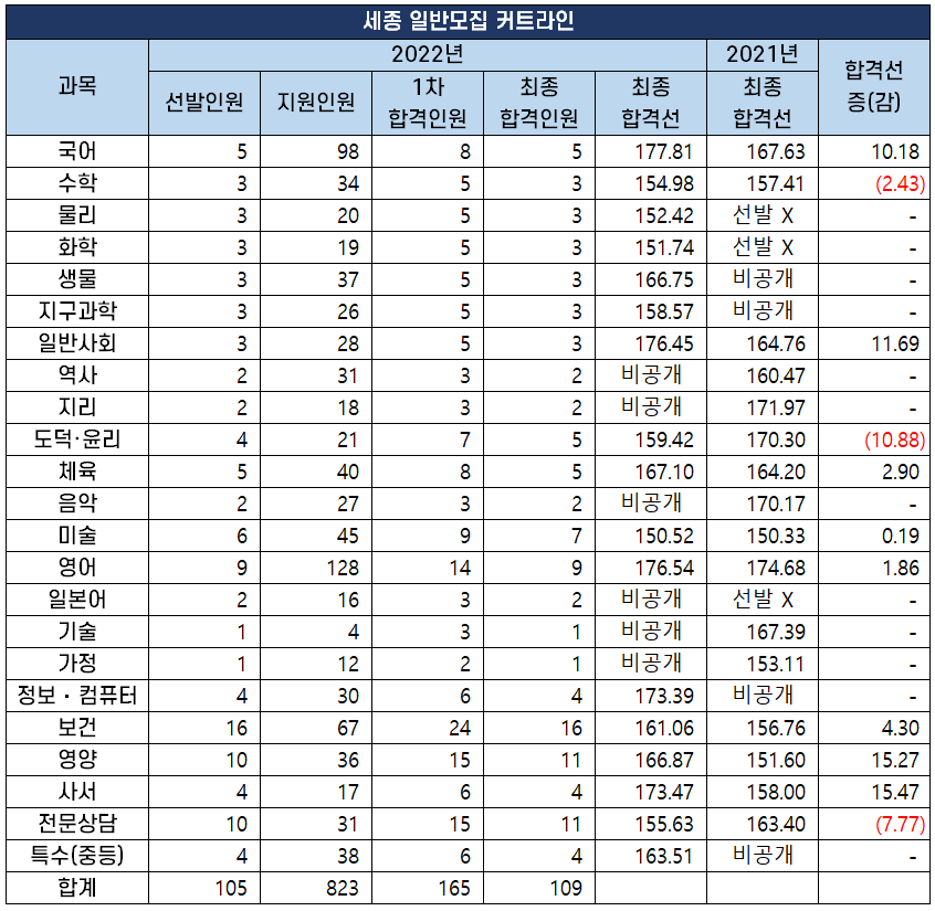 2022년 중등 임용 고시 과목별 최종 커트라인(합격선) 분석