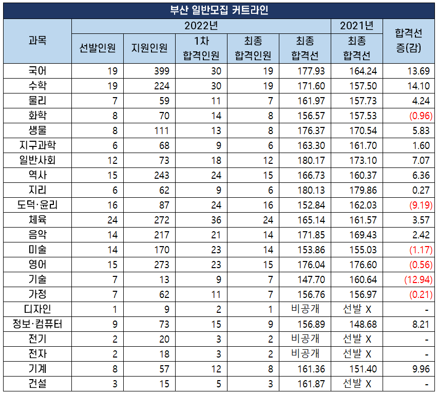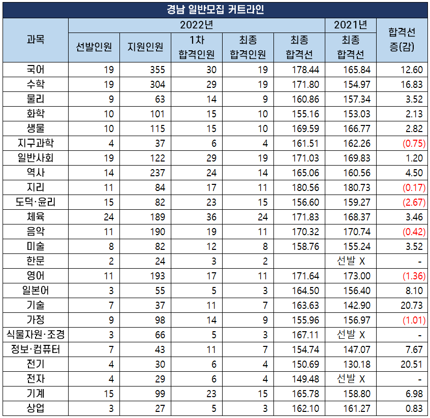 | 과목 | 2022년 | 2021년 | 합격선 증(감) |