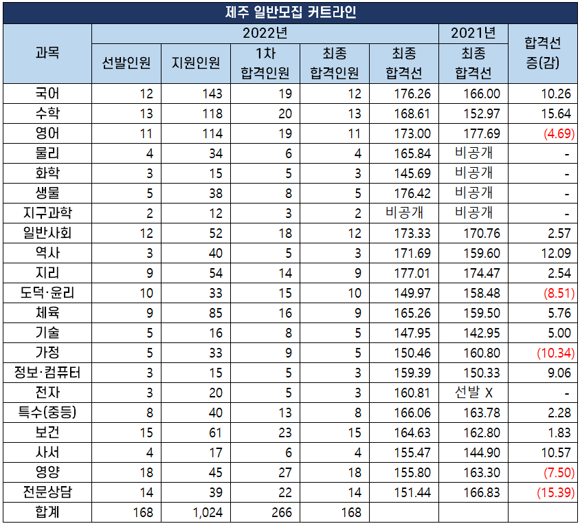 제주도 교육청에서 선발하는 공립 중등 학교 교사, 보건·사서·전문상담·영양· 특수(중등)교사 최종 합격인원 및 합격선은 아래 표와 같습니다.