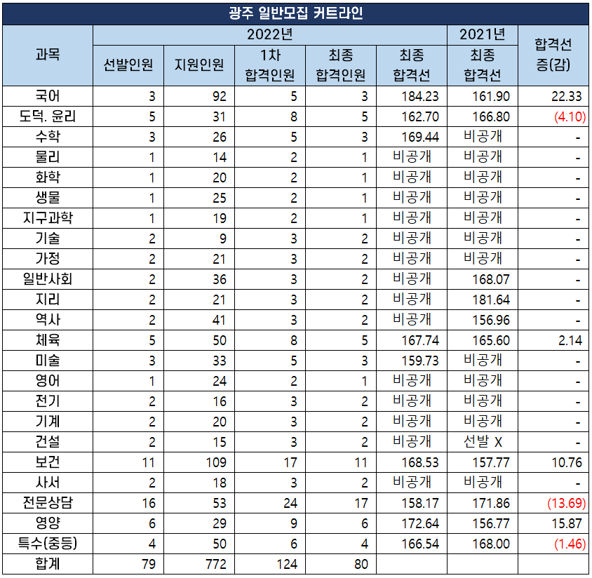 광주 교육청에서 선발하는 공립 중등 학교 교사, 보건·사서·전문상담·영양· 특수(중등)교사 최종 합격인원 및 합격선은 아래 표와 같습니다.