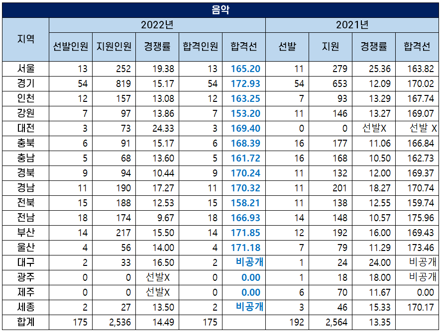 2022년도 중등임용고시 음악 과목 최종 합격선은 2021년보다 하락한 지역이 더 많은데요. 가장 큰 폭으로 합격선이 하락한 강원도가 가장 낮은 커트라인 153.20점을 기록하며 지난해보다 합격선이 15.87점 하락했습니다.