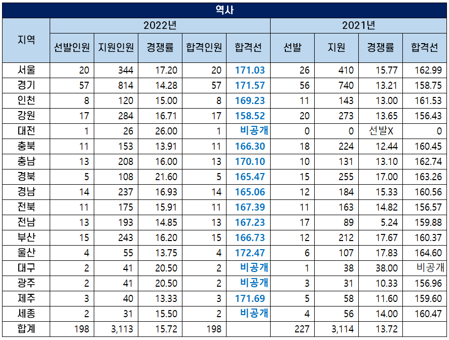 2022년도 중등임용고시 역사 과목 최종 합격선은 2021년보다 상승했습니다. 가장 큰 폭으로 합격선이 상승한 경기도의 커트라인은 171.57점으로 지난해보다 합격선이 12.82점 상승했습니다.